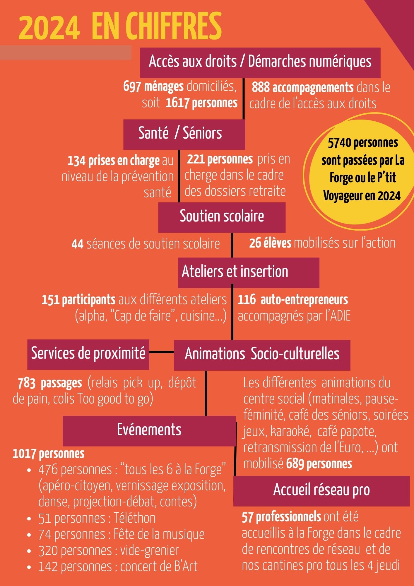 En 2024, ce sont 5740 personnes qui ont participé aux différentes activités, services, événements de La Forge2024 EN CHIFFRES-4 Document PDF — 61 KoLa Forge, c'est aussi une équipe, un conseil d'administration, des bénévoles, des jeunes en formation sans oublier les amis sur les réseaux sociaux2024 EN CHIFFRES-5 Document PDF — 653 Ko